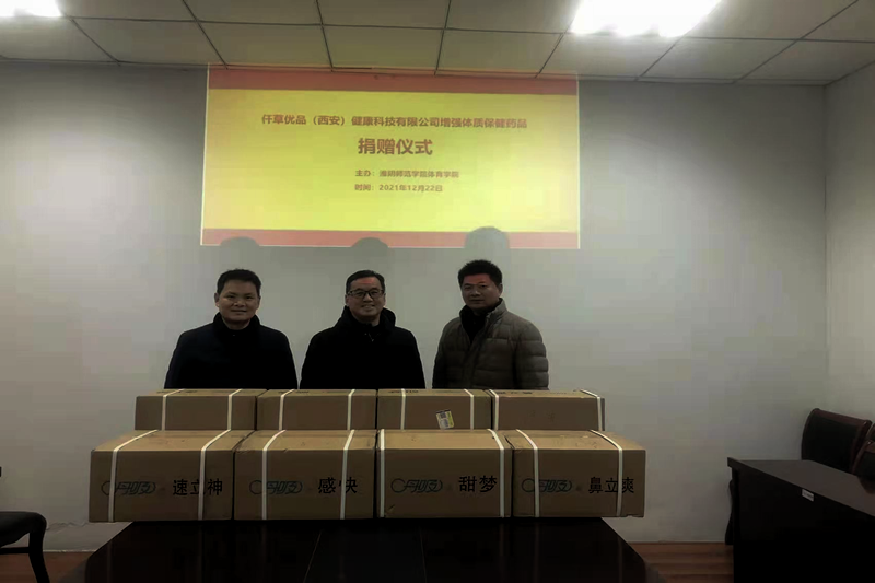 2021年12月22日上午,仟草优品(西安)健康科技有限公司向淮阴师范学院开云手机登录入口捐赠“丹吸”(速立神480盒、感快480盒、鼻立爽480盒、甜梦480盒)系列产品,共计157920.00元,用于师生健康防护。”开云手机登录入口副院长蔺新茂对仟草优品(西安)健康科技有限公司领导及全体员工的深情厚意表示感谢,同时表达要用好管好这批药品。