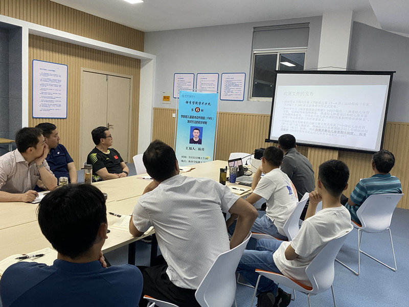 陈勇博士以“学龄前儿童基本动作技能(FMS)测评方法的初步研制”为题进行主旨汇报,围绕问题来源、基本运动技能(FMS)评估工具、特定用途的工具筛选、研究思路以及存在问题等方面与各位青年教师进行深入讨论。各位教师也从项目选择、指标筛选、测量方法、人群特征、城乡差异等方面提出可行性建议。