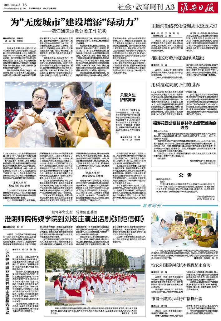 淮安日报2023年3月18日:日前,淮阴师范学院开云手机登录入口师生联合党支部赴周恩来纪念馆开展党性教育活动,通过参观主题图片展、重温入党誓词等形式,教育引导学生党员传承红色基因、坚定理想信念、永葆入党初心、勇担时代使命。 ■通讯员 丁光明